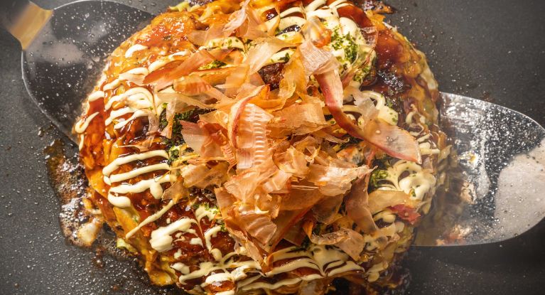日式關西炒麵帶有濃郁的甜辣醬和鰹魚味。粗麵條與特製的濃厚醬汁十分相配。